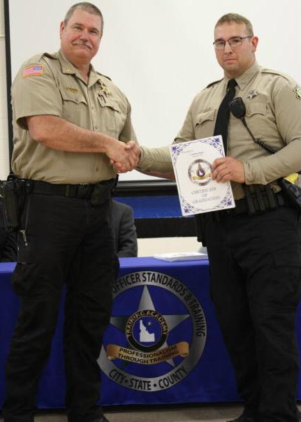 Clearwater County Sheriff's Deputy completes Idaho POST Patrol Academy Clearwater County Sheriff's Deputy Wyatt Yoemans has successfully graduated from Idaho POST (Peace Office Standards Training) Academy #207. Clearwater County Sheriff's Chief Deputy Mike Gladhart (left) congratulates Deputy Wyatt Yoemans on successfully completing patrol training. (Photo courtesy of Clearwater County Sheriff's Office) |