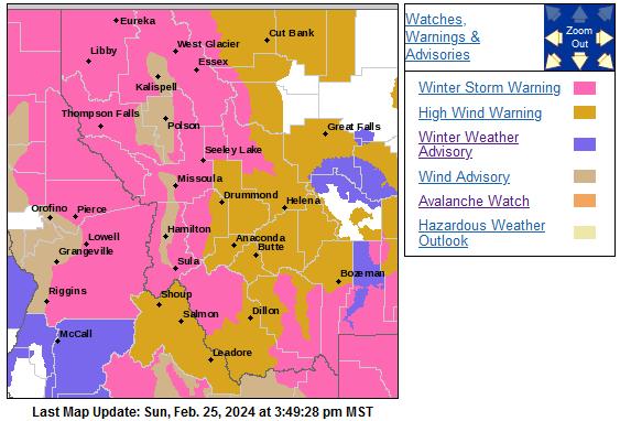 National Weather Service issues Winter Storm Warning, Wind Advisory National Weather Service-Missoula has issued a Winter Storm Warning for the Northern and Southern Clearwater Mountains and a Wind Advisory for the Orofino/Grangeville Region from Sunday afternoon through Monday afternoon. Clearwater Mountains Heavy snow is expected with total snow accumulations 2 to 6 inches in the valleys and 10 to 20 inches in the mountains including Lolo and Lost Trail passes. Winds gusting as high as 40 miles per hour in the valleys and up to 60 mph in the mountains. Areas of particular note are: Pierce, Elk River, Idaho Highway 11 Pierce to Headquarters, U.S. Highway 12 Lowell to Lolo Pass, Lolo Pass, Elk City, Dixie, and Highway 93 Sula to Lost Trail. The warning is from 4 p.m. Pacific Standard Time Sunday to 1 p.m. PST Monday. Travel could be very difficult to impossible. The hazardous conditions could impact the Monday morning and evening commutes. Strong winds could cause extensive damage to trees and power lines. The strongest winds and heaviest snowfall will be during overnight into the morning hours. Pierce, elevation 3,085 feet Sunday night: Rain before 1 a.m., then rain and snow. Snow level 5,100 feet lowering to 3,600 feet after midnight. Low around 27. Breezy, with a west-southwest wind around 23 mph, with gusts as high as 34 mph. Chance of precipitation is 100%. New snow accumulation of 1 to 2 inches possible. Monday: Snow. High near 33. West wind 13 to 18 mph, with gusts as high as 26 mph. Chance of precipitation is 100%. New snow accumulation of 2 to 4 inches possible. Monday night: Snow. Low around 20. West southwest wind 7 to 9 mph. Chance of precipitation is 90%. New snow accumulation of 2 to 4 inches possible. Orofino/Grangeville Region, Lower Hells Canyon/Salmon River Region A Wind Advisory is in effect from 1 p.m. Sunday to 10 a.m. PST Monday. Southwest winds 20 to 30 mph with gusts up to 60 mph are expected with total snow accumulations of a trace to 3 inches in the valleys and 2 to 6 inches in the higher elevations including Whitebird summit. Areas of particular note are: Orofino/Grangeville Region and Lower Hells Canyon/Salmon River Region. Gusty winds will blow around unsecured objects. Tree limbs could be blown down and a few power outages may result. The strongest winds and heaviest snowfall will be during the overnight hours into the morning. Winds this strong can make driving difficult, especially for high profile vehicles. Use extra caution. Orofino, elevation 1,039 feet Sunday night: Rain. Snow level 5,500 feet lowering to 2,200 feet after midnight . Low around 35. Breezy, with a west wind 21 to 29 mph, with gusts as high as 44 mph. Chance of precipitation is 100%. New precipitation amounts between a quarter and half of an inch possible. Monday: Snow. High near 42. Breezy, with a west wind 14 to 23 mph, with gusts as high as 33 mph. Chance of precipitation is 80%. New snow accumulation of less than a half inch possible. Monday night: Snow. Low around 28. West southwest wind 6 to 10 mph. Chance of precipitation is 80%. New snow accumulation of less than one inch possible. |