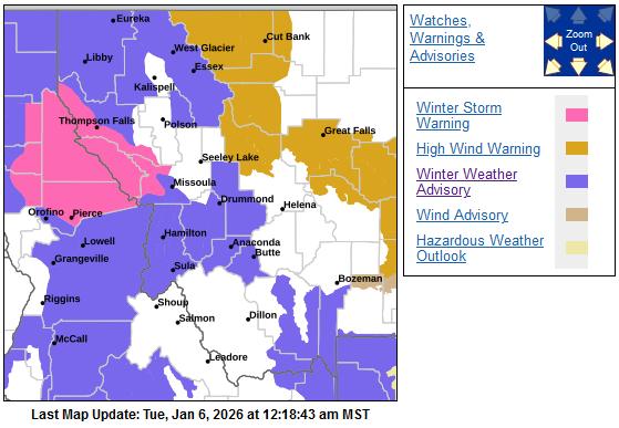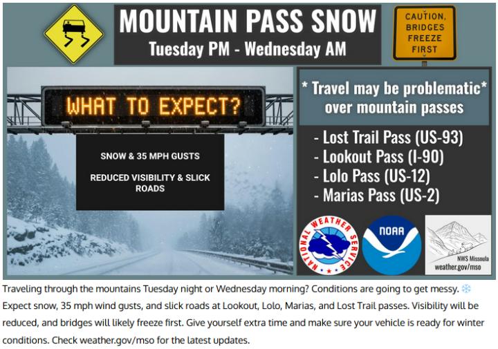 National Weather Service issues Winter Advisory, Winter Warning National Weather Service-Missoula has issued a Winter Storm Advisory for the Southern Clearwater Mountains and Orofino/Grangeville Region from Monday afternoon through Tuesday morning and Winter Storm Warning for the Northern Clearwater Mountains from 11 a.m. Tuesday through 10 a.m. Wednesday. Snow is expected. There is a likelihood of minor winter weather impacts. Total snow accumulations up to one inch in the Camas Prairie, but up to 3 inches at Elk City and Dixie. Lolo Pass snowfall will range from 2 to 4 inches. Areas of particular impact include: Greer Grade, US Highway 12 Lowell to Lolo Pass, Dixie, Grangeville and vicinity, Camas Prairie, Whitebird Grade, and Elk City. Winter traveling conditions are forecast for the areas of impact. For minor winter weather impacts, expect a few inconveniences to normal activities. Use caution while driving. The hazardous conditions could impact the Monday evening and Tuesday morning commutes, especially over higher passes. Precautionary/Preparedness Actions Slow down and use caution while traveling. The latest road conditions can be obtained by calling 5 1 1. Orofino, elevation 1,039 feet Monday night: Patchy fog. Otherwise, mostly cloudy, with a low around 34. Calm wind. Tuesday: Rain, mainly after 1 p.m. Patchy fog before noon. High near 42. Light and variable wind. Chance of precipitation is 80%. New precipitation amounts of less than a tenth of an inch possible. Tuesday night: Rain. Low around 36. Light and variable wind becoming south around 6 miles per hour in the evening. Chance of precipitation is 100%. New precipitation amounts between a quarter and half of an inch possible. Wednesday: Rain likely, mainly before 11 a.m. Snow level 3,100 feet lowering to 2,100 feet. Mostly cloudy, with a high near 43. West wind 5 to 7 mph. Chance of precipitation is 60%. New precipitation amounts of less than a tenth of an inch possible. Winter Storm Warning A Winter Storm Warning has been issued for the Northern Clearwater Mountains from 11 a.m. Tuesday through 10 a.m. Wednesday. Heavy snow is expected. There is a likelihood of major winter weather impacts. Total snow accumulations between 2 and 5 inches at lower elevations, 6 and 12 inches above 3,000 feet and 12 to 18 inches in the high terrain. Winds could gust as high as 35 mph. Areas of particular impact are: State Highway 11 Pierce to Headquarters, Pierce, and Elk River. For major winter weather impacts, expect considerable disruptions to normal activities. Dangerous or impossible traveling conditions are forecast. Avoid travel in the impacted areas if possible. The hazardous conditions could impact the Tuesday evening and Wednesday morning commutes, especially over higher passes. Precautionary/Preparedness Actions Those who must travel, keep an extra flashlight, food, and water in the vehicle in case of an emergency. The latest road conditions can be obtained by calling 5 1 1. Pierce, elevation 3,085 feet Monday night: A slight chance of snow before 3 a.m., then a slight chance of snow after 4 a.m. Patchy fog. Otherwise, mostly cloudy, with a low around 26. Calm wind. Chance of precipitation is 20%. Tuesday: Snow likely before 2 p.m., then snow, possibly mixed with rain between 2 p.m. and 3 p.m., then snow after 3 p.m. Patchy fog before 11 a.m. High near 35. Calm wind becoming southwest around 5 mph in the afternoon. Chance of precipitation is 90%. New snow accumulation of less than one inch possible. Tuesday night: Rain and snow. Snow level 3,800 feet. Low around 28. Southwest wind 3 to 5 mph. Chance of precipitation is 100%. New snow accumulation of 2 to 4 inches possible. Wednesday: Snow, mainly before 10 a.m. High near 34. West southwest wind around 5 mph. Chance of precipitation is 80%. New snow accumulation of 1 to 3 inches possible. Wednesday night: Snow. Patchy fog. Low around 22. Calm wind. Chance of precipitation is 80%. New snow accumulation of 2 to 4 inches possible. |