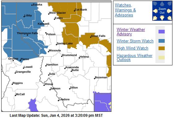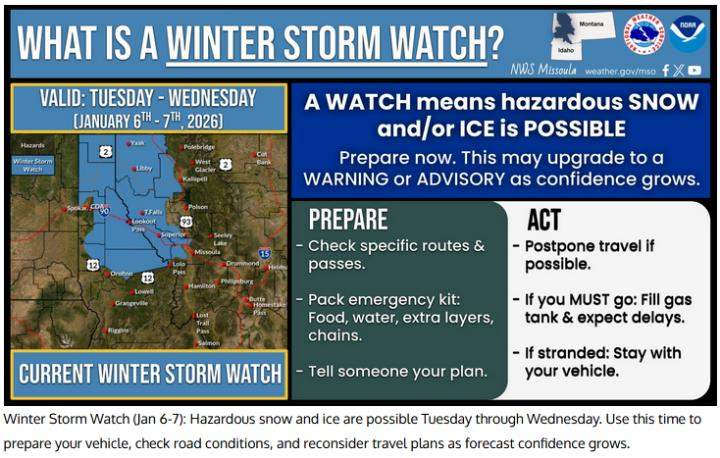 National Weather Service issues Winter Storm Watch for upper elevations National Weather Service-Missoula has issued a Winter Storm Watch for the Northern Clearwater Mountains from Tuesday morning through Wednesday morning. Heavy snow is possible. There is a chance of moderate to major winter weather impacts. Total snow accumulations between 6 and 12 inches possible above around 3,000 feet. Higher amounts of 12 to 18 inches possible in the high terrain. Winds could gust as high as 35 miles per hour. Areas of particular impact include: Pierce, State Highway 11 Pierce to Headquarters, and Elk River. For major winter weather impacts, expect considerable disruptions to normal activities and dangerous or impossible traveling conditions. Avoid travel in the impacted areas if possible. Widespread closures and disruptions to infrastructure may occur. The hazardous conditions could impact the Tuesday evening and Wednesday morning commutes, especially over higher passes. Precautionary/Preparedness Actions Monitor the latest forecasts for updates on this situation. Pierce, elevation 3,085 feet Monday: Snow, possibly mixed with rain, mainly before noon. Areas of fog. Snow level 3,200 feet. High near 36. Calm wind. Chance of precipitation is 90%. New snow accumulation of less than one inch possible. Monday night: A chance of snow before 10 p.m., then a slight chance of snow after 4am. Patchy fog. Otherwise, mostly cloudy, with a low around 25. Calm wind. Chance of precipitation is 30%. New snow accumulation of less than a half inch possible. Tuesday: Snow, mainly after 10 a.m. Patchy fog before 11 a.m, then patchy fog after 4 p.m. High near 35. Calm wind becoming southwest around 5 mph in the afternoon. Chance of precipitation is 80%. New snow accumulation of around an inch possible. Tuesday night: Rain and snow, becoming all snow after 1 a.m. Patchy fog before 7 p.m. Low around 26. Chance of precipitation is 100%. New snow accumulation of 2 to 4 inches possible. Wednesday: Snow, mainly before 10 a.m. High near 34. Chance of precipitation is 80%. New snow accumulation of around an inch possible. Elk River, elevation 2,861 feet and Heardquarters at 3,160 feet National Weather Service-Missoula does not give a detailed forecasts for either area |