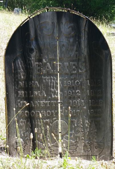 Tyra Babies is the answer for Number 514 of Orofino History Trivia a special feature to celebrate the history and heritage of Clearwater Country. Join in the discovery! Monday: All together Tuesday: Marked with carved wood Wednesday: 1910-1919 Thursday: Tragic Friday: All very young Saturday: Their father was involved in logging and then construction. Monday: Mother from Wisconsin Tuesday: Their father worked on several of the log drives. Wednesday: Three girls, one boys Thursday: Father from Kentucky Friday: Hill Cemetery Saturday: Father's name was like a frontiersman's The four Tyra Babies grave is marked by a weathered wooden marker. All four died young, very young and without more research the cause was somewhat a mystery for people visiting Hill Cemetery in Orofino. The marker lists the three girls and one boy as: Hilma 1912-1913, Jeannette 1915-1918, Nina 1910-1913 and Woodroy (Woodrow August) 1917-1918. The marker does not give any further information about their parents or other family members either. However, a Google search brought me to a bit more information. including a Spokesman Review mention of the death of the youngest daughter of Mr. and Mrs. Boone Tyra Hilma (or Elma in some listings). That first name of her father opened another door and pretty soon I was able to get info from the Clearwater Historical Museum about the 'Daniel Boone Tyra' and his wife Olga or Ollie. Their obituaries are in old newspapers at the museum. Besides information about their lives, the obituaries also listed surviving children. Using Family Search (familysearch.org) I was able to find death certificates for each of the children and learn their exact birthdates, death dates (which didn't always match the marker)and cause of death. One would suppose that with the death dates of some of the children, it may have been the Influenza Epidemic of 1918-1919, but none of the certificates indicated that. Each child did die of an intestinal problem. Family Search also gave access to census records that listed the other children. It is interesting to see what a bit of reseach and connections at the museum can reveal about lives of those who would otherwise be a mystery. Now for some action. From the photo, one can see that marker has deteriorated and cracked very badly. Don Gardner who reminded me of this historical marker would like to see it preserved. He is checking into what it would take to cover it with Plexiglass or protect it some other way. Those who would like to be involved may email him at: fire@parnasas.com. Sponsored by: