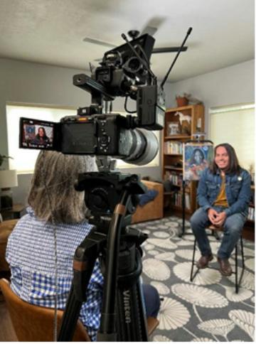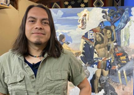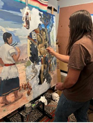 Painter Lupe Galván melds indigenous heritage with a love of European painting Idaho Public Television has launched an online video series on its social media platforms called createid that showcases artists and other makers in Idaho. Remastered: Lupe Galván ," producer Marcia Franklin talks to the Owyhee County painter about his work, which blends his interest in European painting with his Latino and indigenous heritage.When Lupe Galván was in sixth grade, his older sister brought an art history book home from college. Galván was immediately enthralled by the images of European paintings in it. "I was in disbelief,'" says Galván. "I would keep it next to the bed, and you know, just look at it and look at it." Galván grew up in rural Owyhee County, Idaho, and did farmwork with his family when he was not in school. "It was really, really hard," he says. "I remember really, really being very upset that I had to do it. I would imagine that I was at the top of the hill, you know, and instead of working, I was actually outside doing plein air paintings." He started drawing and painting in elementary school, and then continued his passion for art by receiving a bachelor's degree from Boise State University and a Master of Fine Arts from the New York Academy of Art. He came back to Idaho to teach and continue his painting practice. "I was intrigued by his artwork, which blends his longstanding interest in European painting with his Latino and indigenous heritage. I was also curious about his creative process. So, over many months, director Troy Shreve and I filmed Lupe for a createid piece as Lupe worked on a painting called 'Ancestors.' It's his reimagining of the famous painting 'Bacchus and Ariadne' by the 16th century Italian painter Titian," said Franklin. "I love Titian paintings. And I guess in some ways I wanted to make it my own," he told Franklin. In the Greek myth depicted by Titian, Ariadne is abandoned on the island of Naxos by her lover, Theseus. She is found by the god Bacchus, who immediately falls in love with her. In his 'remastering' of the painting, Galván substitutes an image of a woman who is reminiscent of his mother and grandmother, both of whom have indigenous Mexican heritage. The woman is reaching out to a man, who is modeled after himself, and the two are about to engage in a 'perpetual dance of time.' Galván also included objects and animals that are referential to his background, including a xoloitzcuintle, a type of Mexican hairless dog, and a San Pedro cactus, from which traditional medicines are derived. "It's really about an investigation of my personal history and paying an homage to that," he says. "It's about sort of recontextualizing European paintings and using European painting traditions to tell something that is not a specifically a European story."