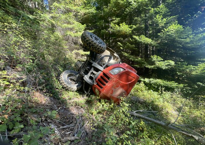 Overdue man found deceased in backcountry search On Friday at about 1:41 a.m., the Clearwater County Sheriff's Office received a report of an overdue person on a UTV (utility-terrain-vehicle) near Elk River. Deputies responded along with Search and Rescue members and began searching for said person. The search covered a very large area from Elk River to Dworshak Reservoir and included searchers in pickups, UTV's, a drone and the Back Country Medics Helicopter. Searchers talked to several other hunters that were camped in the area and several of them assisted in the search. The missing UTV was found at approximately noon near the South Fork of Robinson Creek by hunters that had volunteered to help. The operator and sole occupant was located deceased near the UTV. The UTV had rolled down off an old logging road and the operator was ejected. The operator was identified as Dale Law, 43, Hayden. Law was a Deputy with the Kootenai County Sheriff's Office. (Photo courtesy of Clearwater County Sheriff's Office) |