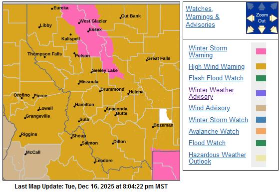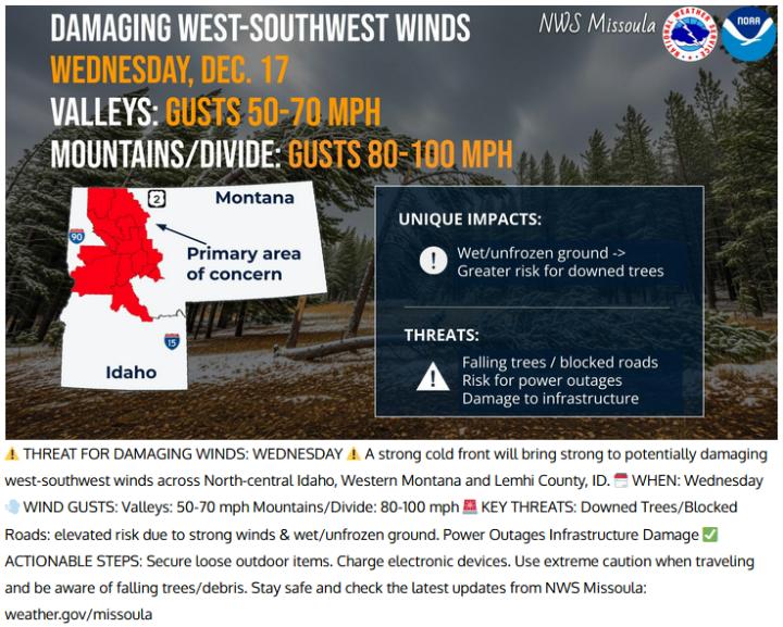 National Weather Service upgrades forecast to a High Wind Warning National Weather Service-Missoula has upgraded the High Wind Watch to a High Wind Warning from 1 a.m. to 1 p.m. Wednesday. Southwest winds 25 to 35 miles per hour with gusts up to 60 mph are expected for the Orofino/Grangeville Region, Southern and Northern Clearwater Mountains and Lower Hells Canyon/Salmon River Region. Damaging winds will blow down trees and power lines. Widespread power outages are expected. Travel will be difficult, especially for high profile vehicles. Precautionary/Preparedness Actions: Remain in the lower levels of your home during the windstorm, and avoid windows. Watch for falling debris and tree limbs. Use caution if one must drive. Orofino Tuesday night: Rain. Low around 41. Calm wind becoming east southeast around 6 mph after midnight. Chance of precipitation is 90%. New precipitation amounts between a tenth and quarter of an inch possible. Wednesday: Rain. Temperature falling to around 41 by noon. West wind 6 to 11 mph increasing to 13 to 18 mph in the morning. Winds could gust as high as 50 mph. Chance of precipitation is 80%. New precipitation amounts between a tenth and quarter of an inch possible. Wednesday night: Rain. Snow level 2,300 feet. Low around 34. West wind 9 to 14 mph becoming light and variable after midnight. Winds could gust as high as 18 mph. Chance of precipitation is 80%. Pierce Tuesday night: Rain and snow. Steady temperature around 39. South wind 6 to 16 mph, with gusts as high as 36 mph. Chance of precipitation is 100%. Total nighttime snow accumulation of less than a half inch possible. Wednesday: Rain and snow. High near 45. West wind 16 to 18 mph, with gusts as high as 47 mph. Chance of precipitation is 80%. New snow accumulation of less than one inch possible. Wednesday night: Rain and snow. Low around 27. West southwest wind around 6 mph becoming calm in the evening. Chance of precipitation is 80%. New snow accumulation of less than a half inch possible. |