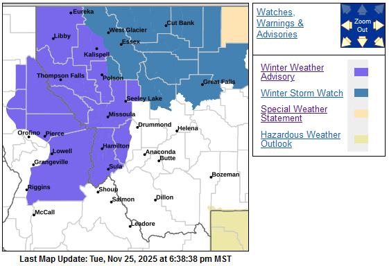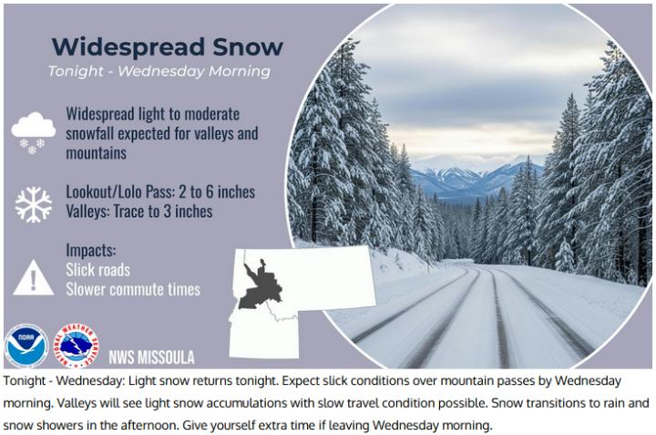 National Weather Service issues Winter Weather Advisory for upper elevations National Weather Service-Missoula has issued a Winter Weather Advisory for the Northern and Southern Clearwater Mountains from 10 p.m. Tuesday through 10 a.m. Wednesday. Snow is expected with the likelihood of minor to moderate winter weather impacts. Total snow accumulations of two t five inches are expected. Areas of particular note are Pierce, Elk River, State Highway 11 from Pierce to Headquarters, U.S. Highway 12 from Lowell to Lolo Pass, Elk City and Dixie. For moderate winter weather impacts expect disruptions to normal activities. Hazardous traveling conditions are possible. Use extra caution while driving. The hazardous conditions could impact the Wednesday morning commute, especially over higher passes. Precautionary/Preparedness Actions: Slow down and use caution while traveling. The latest road conditions are available by calling 5 1 1 or https://511.idaho.gov/#:Alerts. |