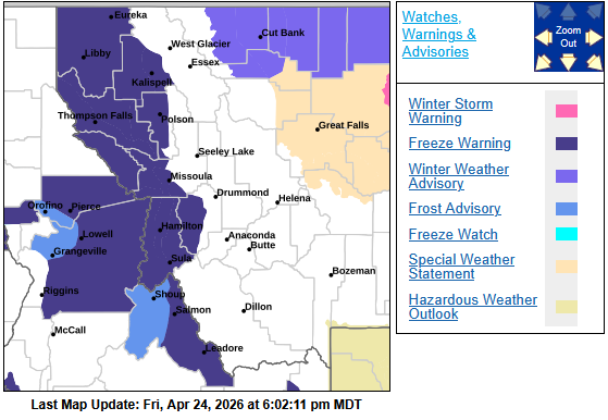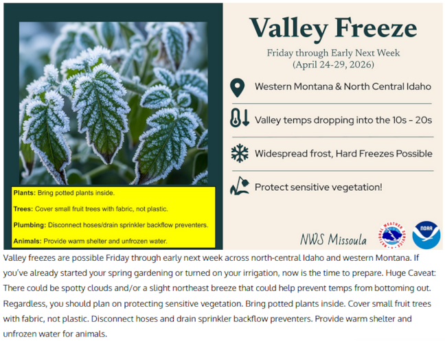 National Weather Service issues Freeze Warning, Frost Advisory National Weather Service-Missoula has issued a Freeze Warning for the Northern Clearwater Mountains and a Frost Advisory for the Orofino/Grangeville Region from 11 p.m. Friday through 7 a.m. Sunday. Freeze Warning Sub-freezing temperatures as low as 22 degrees expected. There is a 30 percent chance for a hard freeze in populated areas above 2,500 feet. Frost and freeze conditions could kill crops and other sensitive vegetation. Possible damage to unprotected outdoor plumbing and irrigation systems with the hard freeze (temperatures in the lower 20s) are forecast. Additional frosts or freezes are possible through Wednesday. Precautionary/Preparedness Actions Take steps now to protect tender plants from the cold. Pierce, elevation 3,085 feet Friday night: Widespread frost, mainly after 9 p.m. Otherwise, partly cloudy, with a low around 24 degrees. Light and variable wind. Saturday: A slight chance of rain between 3 p.m. and 4 p.m. Widespread frost before 9 a.m. Snow level rising to 4,000 feet in the afternoon. Otherwise, mostly sunny, with a high near 52. Calm wind. Chance of precipitation is 20%. Saturday night: Widespread frost, mainly after 11 p.m. Otherwise, partly cloudy, with a low around 25. Calm wind. Sunday: A 40% chance of rain after 11 a.m. Widespread frost before 9 a.m. Snow level rising to 4,400 feet in the afternoon. Otherwise, partly sunny, with a high near 53. Light and variable wind. ![]() Frost Advisory Temperatures as low as 27 degrees will result in frost formation. Frost could harm sensitive outdoor vegetation. Sensitive outdoor plants may be killed if left uncovered. Additional frosts are possible through Wednesday. Precautionary/Preparedness Actions Take steps now to protect tender plants from the cold. Orofino, elevation 1,039 feet Friday night: Widespread frost, mainly after 3 a.m. Otherwise, mostly clear, with a low around 31 degrees. West northwest wind 5 to 7 miles per hour becoming calm in the evening. Saturday: Widespread frost, mainly before 8 a.m. Otherwise, sunny, with a high near 61. Calm wind becoming northwest around 5 mph in the afternoon. Saturday night: Areas of frost after 3 a.m. Otherwise, partly cloudy, with a low around 33. North northwest wind around 5 mph becoming calm in the evening. Sunday: A 30% chance of rain after noon. Areas of frost before 8am. Otherwise, mostly sunny, with a high near 62. Calm wind becoming west northwest around 6 mph in the afternoon. ![]() |