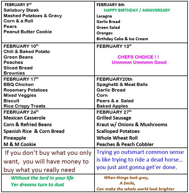 Orofino Senior Meal Site announces lunch menu for February 2026 Menus have been approved by our Registered Dietitian. Meals can be delivered to people unable to attend the Meal Site. Contact for more information - Orofino Meal Site 208-476-4238. USDA is an equal opportunity provider and employer. All meals are served with butter/margarine; choice of milk, yogurt or string cheese. Meals are subject to change. Menu sponsored by: ![]() |