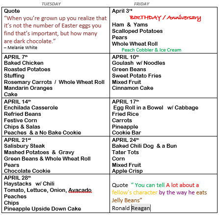 Orofino Senior Meal Site announces lunch menu for April 2026 Menus have been approved by our Registered Dietitian. Meals can be delivered to people unable to attend the Meal Site. Contact for more information - Orofino Meal Site 208-476-4238. USDA is an equal opportunity provider and employer. ![]() All meals are served with butter/margarine; choice of milk, yogurt or string cheese. Meals are subject to change. Menu sponsored by: ![]() |