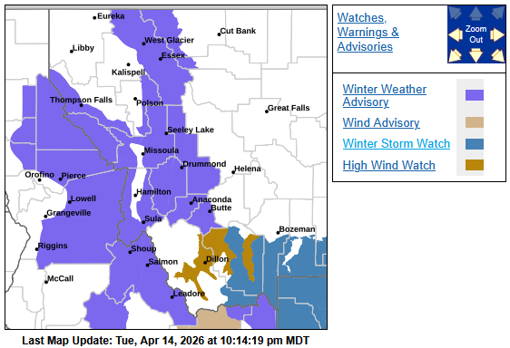 National Weather Service issues Winter Weather Advisory National Weather Service-Missoula has issued a Winter Weather Advisory for the Northern and Southern Clearwater Mountains from 5 p.m. Wednesday to 8 a.m. Thursday. Snow is expected. There is a likelihood of minor to moderate winter weather impacts. Total snow accumulations of 2 to 5 inches below 5,000 feet, with 5 to 10 inches in the higher terrain. Areas of particular impact include: U.S. Highway 12 Lowell to Lolo Pass, Highway 11 Pierce to Headquarters, Pierce, Elk River, Elk City and Dixie. For moderate winter weather impacts, expect disruptions to normal activities. Hazardous traveling conditions. Use extra caution while driving. Closures and disruptions to infrastructure may occur. The hazardous conditions could impact the Wednesday morning and evening commutes, especially over higher passes. Precautionary/Preparedness Actions Outdoor recreationalists should be prepared for winter conditions. Snowfall could impact roads and cold temperatures may result in hypothermia. Slow down and use caution while traveling. The latest road conditions are available by calling 5 1 1. ![]() Pierce, elevation 3,085 feet Tuesday night: Rain, possibly mixed with snow, becoming all rain after 5 a.m. Low around 34 degrees. Light south southwest wind. Chance of precipitation is 100%. Little or no snow accumulation expected. Wednesday: Rain, possibly mixed with snow before 9 a.m., then rain between 9 a.m. and 3 p.m., then snow after 3 p.m. Snow level 4,700 feet lowering to 3,400 feet in the afternoon. High near 43. South southwest wind around 6 miles per hour becoming west northwest in the afternoon. Chance of precipitation is 100%. New snow accumulation of less than a half inch possible. Wednesday night: Snow. Low around 26. West wind around 5 mph becoming calm in the evening. Chance of precipitation is 90%. New snow accumulation of 1 to 2 inches possible. Thursday: Snow. High near 39. Calm wind becoming west 5 to 7 mph in the afternoon. Chance of precipitation is 90%. New snow accumulation of around an inch possible. Thursday night: A 40 percent chance of snow, mainly before 11 p.m. Mostly cloudy, with a low around 25. West wind around 5 mph becoming calm in the evening. New snow accumulation of less than a half inch possible. |