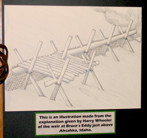 Harriet Reece is the winner! Nez Perce fishing weirs on the North Fork of the Clearwater River at Bruce's Eddy is the answer for Week 248 of Orofino History Trivia a special feature to celebrate the history and heritage of Clearwater Country. Join in the discovery! Monday: Lines deteremined timing Tuesday: Similar to those at other locations Wednesday: Constructed yearly Thursday: Bruce's Eddy Clearwater Historical Museum Director Bernice Pullen drew this diagram of the fishing weir from the description of Harry Wheeler. In the book Salmon and the People: Fish and Fishing in Nez Perce Culture by Dan Landean and Allen Pinkham, Harry Wheeler explains how the Nez Perce from around Ahsahka would use the narrow part of the North Fork to build a weir. There was a large rock formation that ascended into the river at Bruce's Eddy (now the location of Dworshak Dam). There was a stone that had three horizontal lines carved into it which was used as a gauge to determine when to start building the trap or weir. The lines were about six to eight inches apart and about six to eight inches long. "When the water exposed the first line it was time to put poles fastened crosswise onto the river. The legs of these cross-pieces were anchored and wedged firmly with rocks. A row of these extended across the river: long poles were laid from the crotch of one to the crotch of the next above the surface, across the full width of the river. While these poles were being set into the water, others would cut short poles five or six feet long and would weave them together with a willow bark into panels, it would look like wicker work: loose enough to let water go through but tight enough to keep fish back. "When the second line was exposed, it was time to put in the weaving. They would bring it down and unroll it. Others would bring more. Panels 5-10 feet long would be placed on the upper side of the cross-pieces that carried the long poles across the river. The top of the panels rested on the poles. The bottom was held down by rocks, and the force of the current helped to keep it in place. Soon this wicker panel extended the full width of the river. Big salmon would come up and that was as far as they could get. "When the third line was exposed it was time to build the platforms and start fishing. By setting a pair of cross-pieces about six feet down stream from the wicker weaving and laying down a long pole between them, poles extending from the wicker panels to the long pole could be placed close enough to make a platform. Men would make several of these platforms and fish from them. Some would make the scaffold project to provide shade for the salmon. Five or six families would work together to make one of these scaffolds which was about as big as a bed. Two or three men fishing from these platforms might easily catch as many as 150 salmon in a day." Sponsored by:
